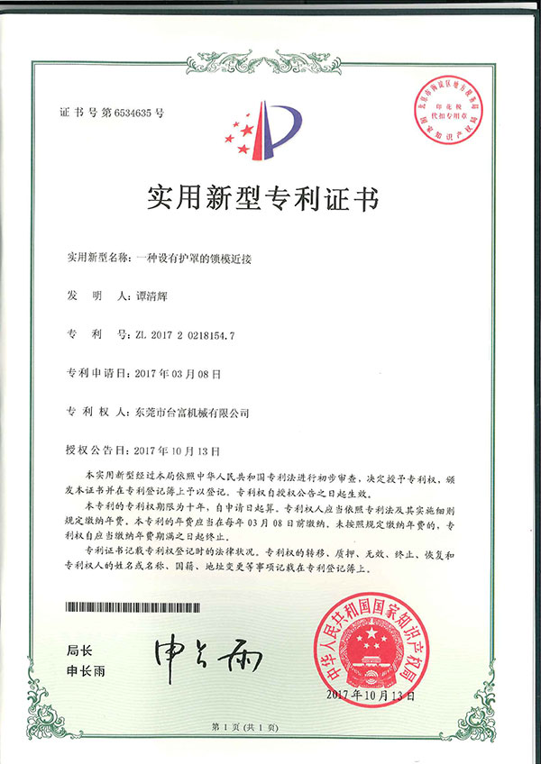 一種設有護罩的鎖模近接專利證書