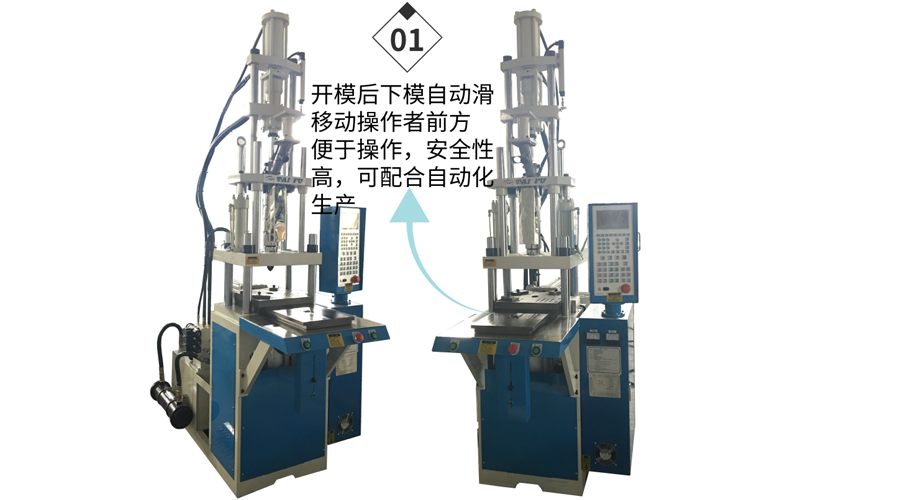 1、在V機種系列上加裝單滑模,讓機械完成一個循環動作,在關模后,下模自動滑移到操作者前方,更便于操作,安全性高且成品頂出也在外部完成。